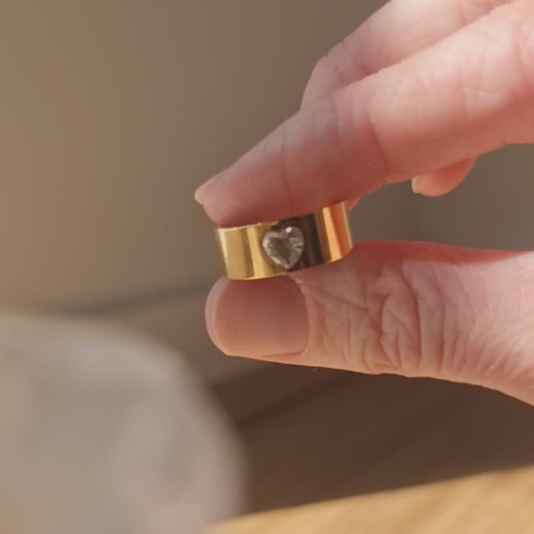Crafted from durable 18k gold-plated stainless steel, this 7mm wide band is elevated with a cubic zirconia heart stone, catching the light with every movement. Designed to be both elegant and everyday-wearable, it pairs beautifully with other Stone + Grace favourites or stands strong on its own.